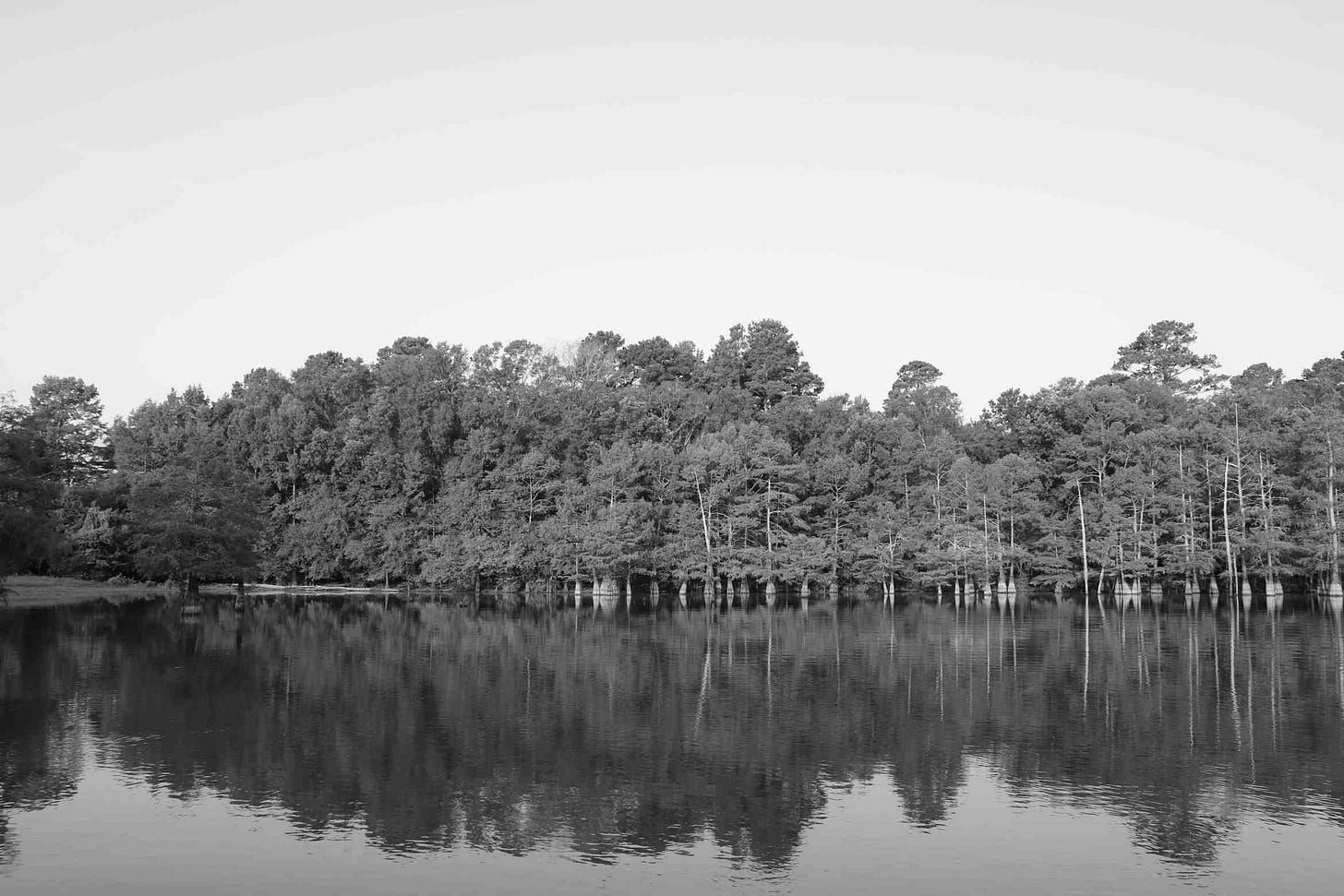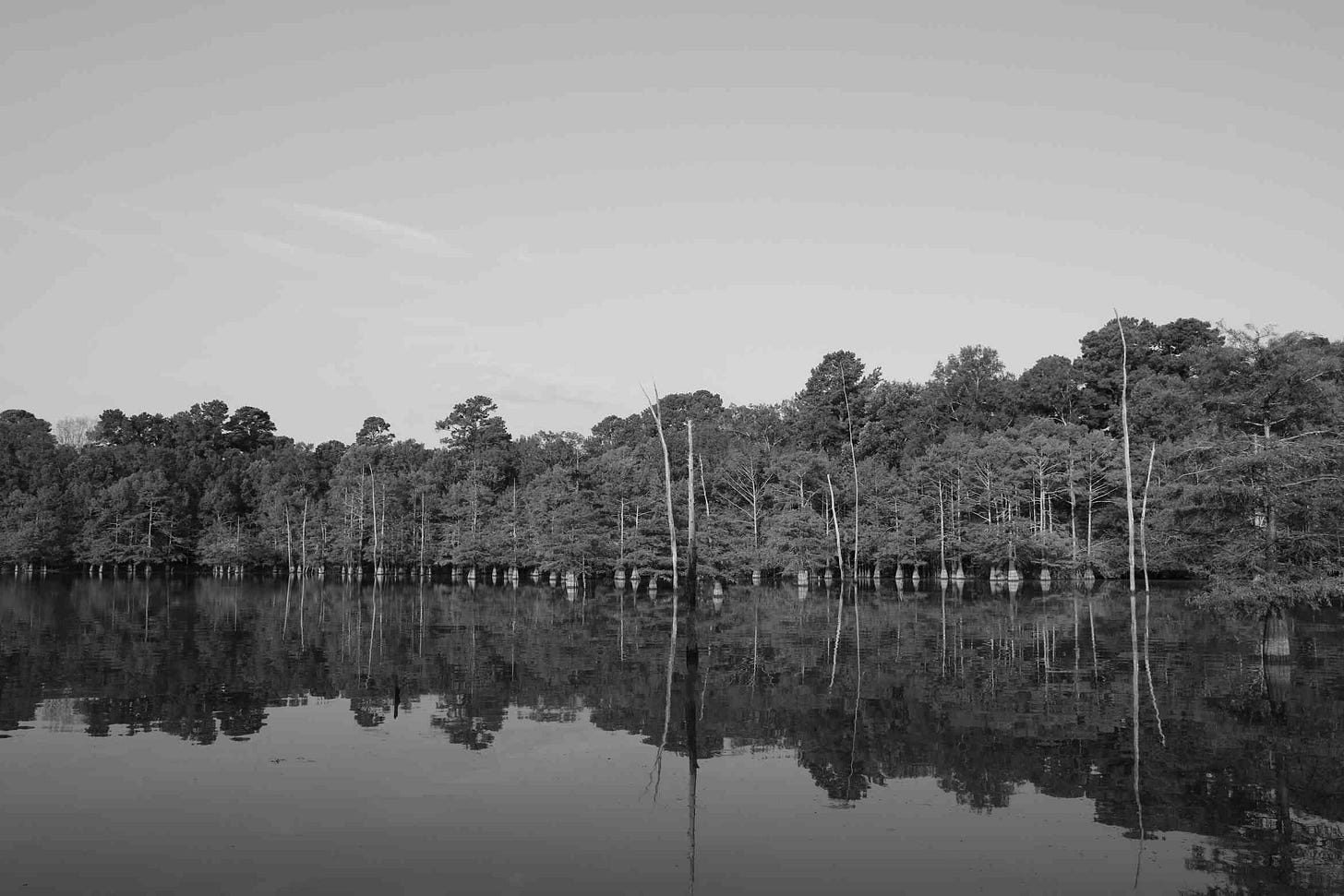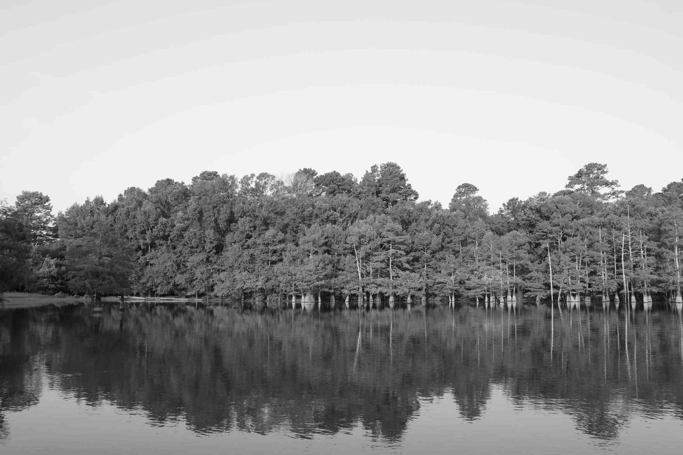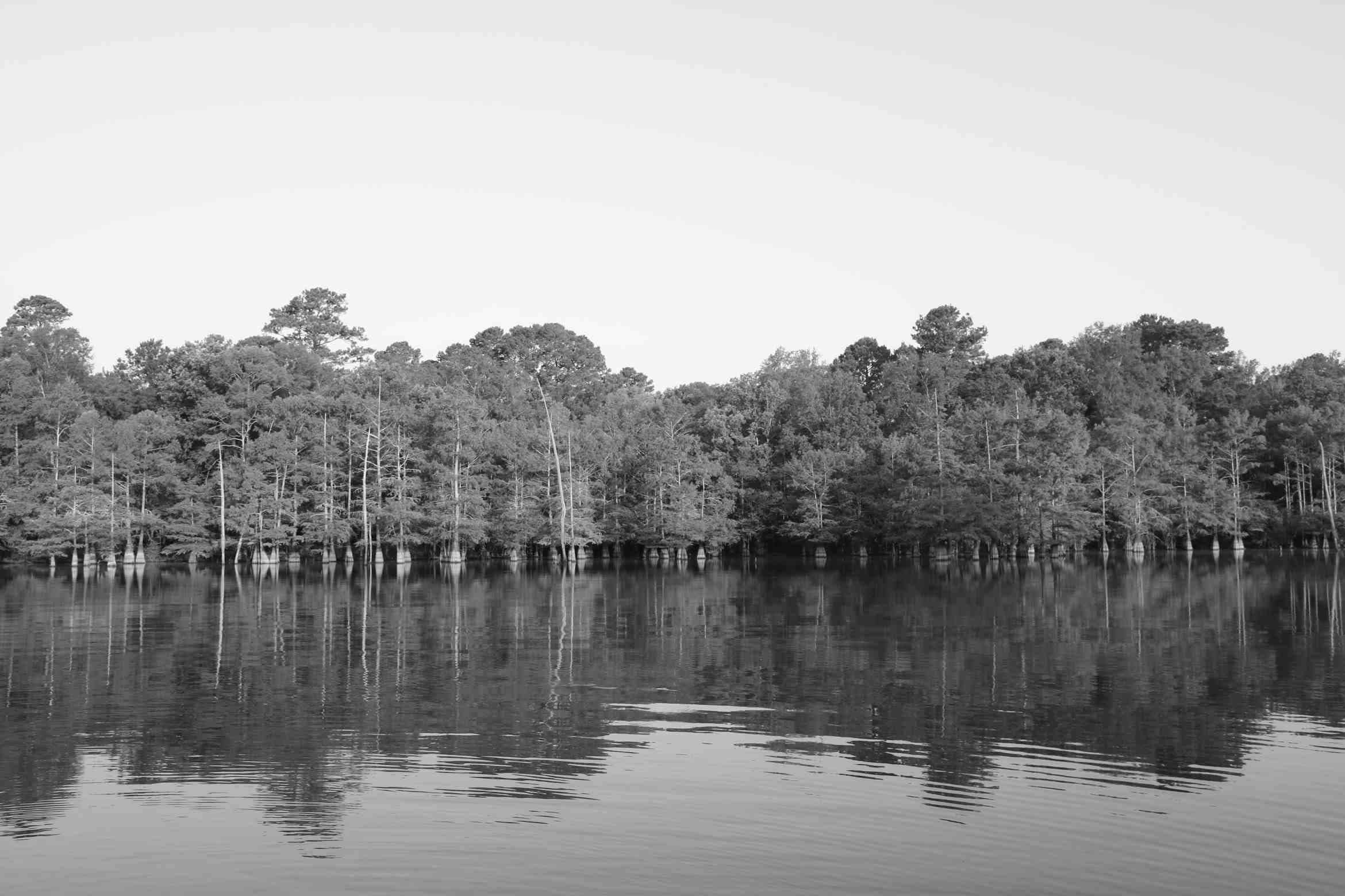 My eyes were instantly drawn to the open shoreline of cypress trees, a calm mirror reflection on the water, and the relaxing sky above.